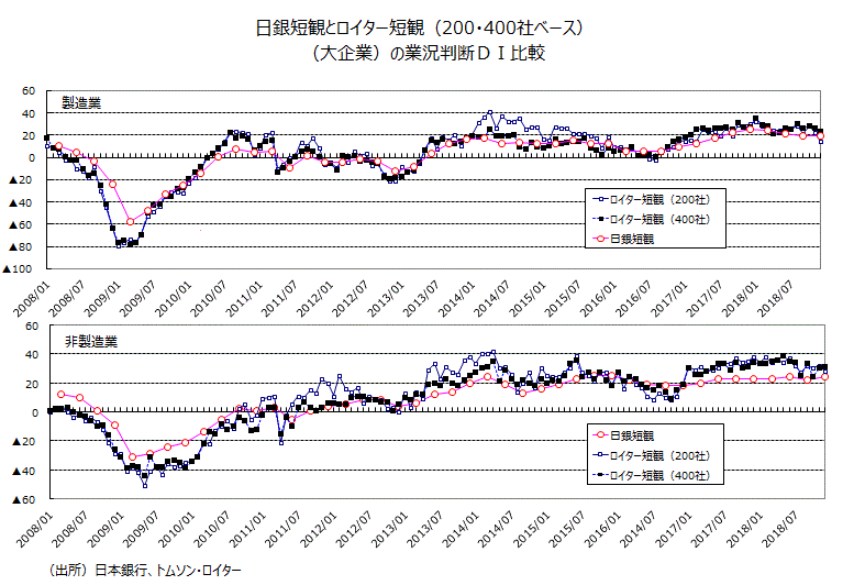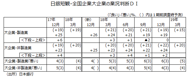 ―大企業・製造業・業況判断DI+19で前期比横這い、4期ぶり悪化止まる。非製造業は改善―