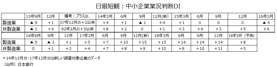 ―中小企業・製造業・業況判断DI+14で前回と同水準、非製造業は+11で改善―