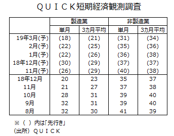 ●QUICK短観12月調査の製造業の3月までの「先行き見通し」は+18で9月実績の+20より2ポイント低下の予想、非製造業の3月までの「先行き見通し」は+31で12月実績の+35から4ポイントの低下予想である。