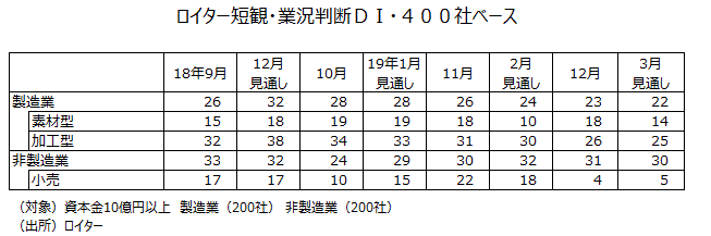 ●一方、ロイター短観12月調査の3月までの「先行き見通し」は、製造業・400社ベースで+22と12月実績の+23から1ポイント低下の見込み、製造業・200社ベースで+14と12月実績の+14と同水準になる見込み、非製造業・400社ベースの3月までの「先行き見通し」は+30と、12月実績の+31から1ポイント低下の見込み、非製造業・200社ベースの3月までの「先行き見通し」は+30と、12月実績の+28から2ポイント改善の予想である。