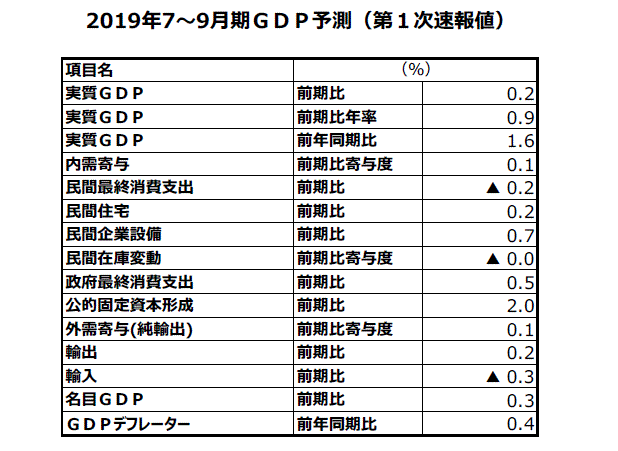 2019年7~9月期実質GDP(第1次速報値)予測