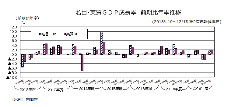 ●18年10~12月期実質GDP成長率・第2次速報値は前期比+0.5%、前期比年率+1.9%となった。第1次速報値の前期比+0.3%、前期比年率+1.4%から上方修正となった。プラス成長は2四半期ぶりだ。