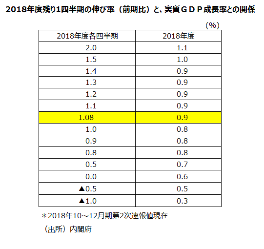 ●政府経済見通しの18年度の実質GDP成長率見込み+0.9%は残り1四半期が前期比年率+4.4%程度(前期比+1.08%程度)と高い伸び率にならないと達成できないことになった。ちなみに、17年度から18年度へのゲタは+0.3%と第1次速報値の時と同じである。但し、残りの1四半期である1~3月期は1月分の関連経済指標が弱いので前期比ゼロ近傍程度のかなり低めの成長率になるかもしれない。