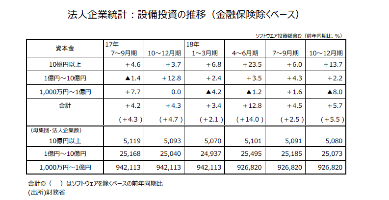 ●18年10~12月期の法人企業統計調査の全産業(金融業・保険業を除くベース)の設備投資(ソフトウェア投資額を除くベース)の前年同期比は+5.5%と、9四半期連続の増加になった。7~9月期の前年同期比+2.5%からは3.0ポイント伸び率が高まった。季節調整済み前期比は+3.3%で2四半期ぶりの増加になった。また、ソフトウェア投資額を含むベースでは10~12月期の全産業の前年同期比は+5.7%だった。7~9月期の前年同期比+4.5%からは1.2ポイント伸び率が高まった。