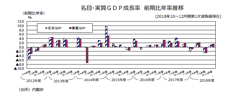●18年10~12月期実質GDP成長率・第1次速報値は前期比+0.3%、前期比年率+1.4%となった。7~9月期の前期比年率▲2.7%のマイナス成長率をもたらした自然災害の影響がなくなり、個人消費や設備投資などが持ち直した。輸出は前期比プラスに転じたものの、中国経済の減速などを背景に、中国を中心としたアジア向けの輸出が弱く、前期比+0.9%と7~9月期の▲1.4%の落ち込みはカバーできなかった。輸入の前期比が+2.7%と堅調だったので、外需の寄与度は▲0.3%と3四半期連続のマイナス寄与になった。