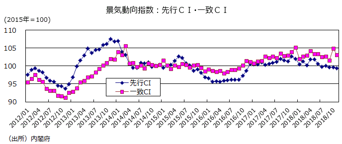 ●11月分の一致CIの指数水準は2015年=100として103.0になった。なお、直近のピークは17年12月分の105.1で、足元の水準は、2.1ポイント低い。10月分の104.9が18年では最も高い水準である。
