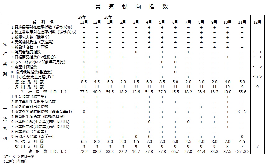 ●また、12月分の先行DIでは、数値が判明している消費者態度指数、日経商品指数、東証株価指数、中小企業売上げ見通しDIの4系列は、中小企業売上げ見通しDI1系列がプラス符号に、消費者態度指数、日経商品指数、東証株価指数の3系列がマイナス符号になることが判明している。12月分速報値段階の先行DIは11.1%以上66.7%以下が確定している。