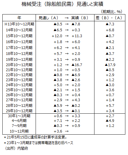 ●18年9月分では「機械受注は、持ち直しの動きがみられるものの、9月の実績は大きく減少した」と変更になった。これは17年11月分の基調判断が「機械受注は、持ち直しの動きがみられる」であったのに対し、17年12月分は、「機械受注は、持ち直しの動きがみられるものの、12月の実績は大きく減少した」と変更になったが、実質的には判断据え置きとなったことと同じであった。こうした表現は16年4月分の「機械受注は、持ち直しの動きがみられるものの、4月の実績は大きく減少した」でもみられた。