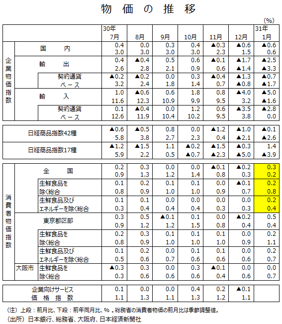 ●1月分の全国消費者物価指数・生鮮食品を除く総合指数は2015年を100とした指数で101.2、前年同月比は+0.8%で、12月分の+0.7%から0.1ポイント上昇した。前年同月比は17年1月分で13カ月ぶりの上昇に転じたあと、25カ月連続の上昇になった。