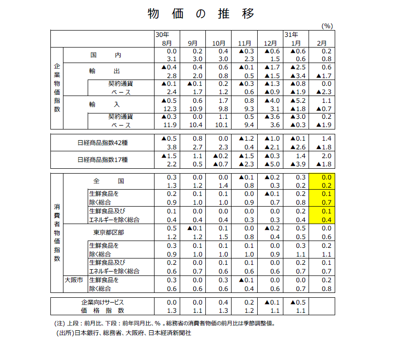 ●2月分の全国消費者物価指数・生鮮食品を除く総合指数は2015年を100とした指数で101.3、前年同月比は+0.7%で、1月分の+0.8%から0.1ポイント鈍化した。前年同月比は17年1月分で13カ月ぶりの上昇に転じたあと、26カ月連続の上昇になった。