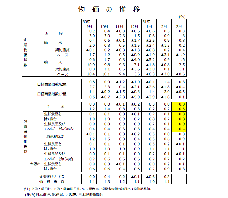 ●3月分の全国消費者物価指数・生鮮食品を除く総合指数・前月比(季節調整値)は0.0%と横這いになった。
