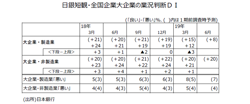 ―大企業・製造業・業況判断DI+12で2期ぶり悪化。非製造業は+21で2期ぶり悪化。―