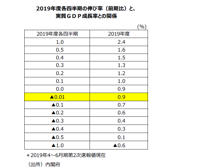 ●19年度内閣府年央試算+0.9%程度達成には残り3四半期で各々前期比年率▲0.0%程度(前期比▲0.01%)程度になることが必要だ。18年度から19年度へのゲタは+0.5%で第1次速報値の+0.6%から下方修正となった。