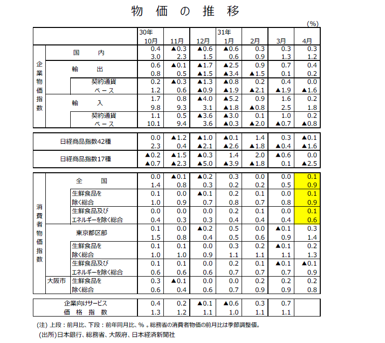 ●4月分の生鮮食品及びエネルギーを除く総合指数は101.6で、前年同月比は3月分と同じ+0.6%になった。前年同月比は17年7月分で+0.1%と5カ月ぶりの上昇に転じ、17年8月分以降19年3月分までの20カ月間は+0.2%~+0.5%の間で推移していたが、4月分でレンジを上抜けた。これで22カ月連続の上昇になった。前月比(季節調整値)は+0.1%の上昇になった。
