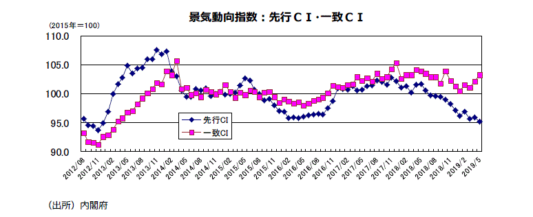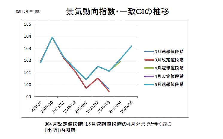 ●5月分の一致CIの指数水準は2015年=100として103.2になった。なお、直近のピークは17年12月分の105.3で、足元の水準はそれに比べるとまだ2.1ポイント低い。18年では最も高かった4月分の104.1に比べると0.9ポイント低い水準である。また、最近で最も低かった1月分の100.4に比べると2.8ポイント高い水準である。