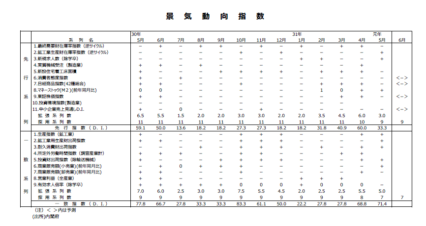 ●5月分の先行DIは33.3%程度と2カ月ぶりに景気判断の分岐点の50%割れになった。速報値からデータが利用可能な9系列中、鉱工業生産財在庫率指数、新規求人数、マネーストックの3系列がプラス符号に、最終需要財在庫率指数、新設住宅着工床面積、消費者態度指数、日経商品指数、東証株価指数、中小企業売上げ見通しDIの6系列がマイナス符号になった。