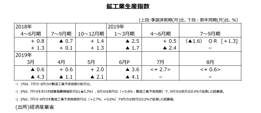 2019年6月分鉱工業生産指数・速報値について