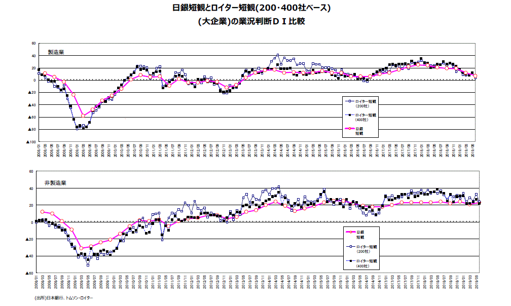 ●今回の日銀短観は、事前の予想通り、米中貿易摩擦の激化などの影響で製造業中心に景況感が引き続き悪化するという厳しい内容になった。但し、6月29日の米中首脳会談の結果は織り込まれていない。一方、非製造業には底堅さが感じられる内容だった。19年度の設備投資計画は6月調査としてはしっかりした結果となった。次回9月調査で、今回の6月調査の先行き見通しから景況感などが上振れるのか、下振れるのか、先行きの景気を占う上で注目される状況だ。