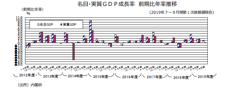 ●19年7~9月期実質GDP成長率・第1次速報値は前期比+0.1%、前期比年率+0.2%となった。4四半期連続のプラス成長となった。内需の前期比寄与度は+0.2%、外需の前期比寄与度は▲0.2%だった。