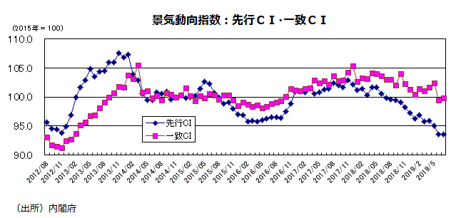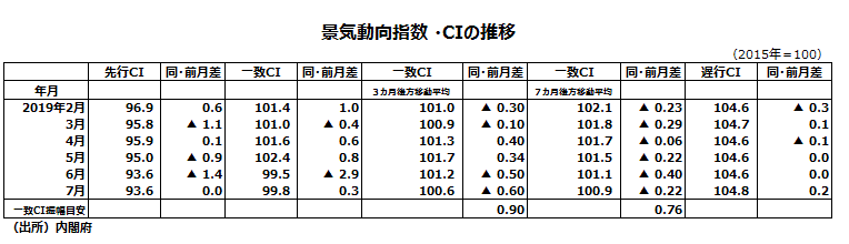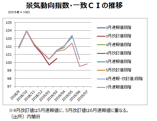 ●一致CIを使った景気の基調判断をみると、16年10月分でそれまでの「足踏みを示している」から「改善を示している」に上方修正された。その後16年11月分~18年8月分まで23カ月連続して同じ最高の基調判断で推移してきていたが、18年9月分~12月分と4カ月連続「足踏みを示している」となった。19年1月分では、「下方への局面変化」に下方修正された。2月分も同じ判断になった。3月分では景気後退の可能性が高いことを意味する「悪化」にさらに下方修正され、4月分でも「悪化」だったが、5月分で「景気後退の動きが下げ止まっている可能性が高いことを示す」意味を持つ「下げ止まり」に上方修正され、6月分、7月分と「下げ止まり」の判断継続になった。