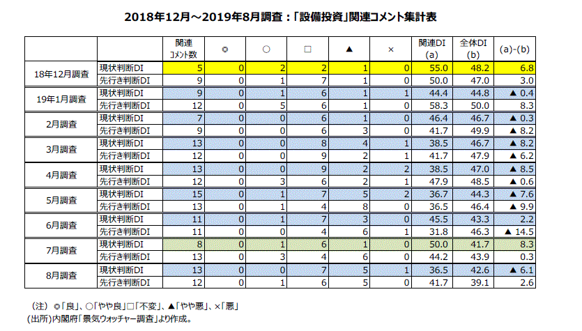 ●景気ウォッチャー調査の設備投資関連・DIの最近の動きをみてみよう。18年12月分の景気ウォッチャー調査では、設備投資関連・現状判断DIは55.0(同5人)、設備投資関連・先行き判断DIが50.0(同9人)。18年のうちは底堅い動きだった。