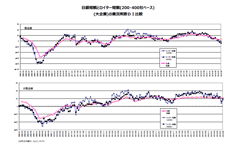 ●今回の日銀短観は、米中貿易摩擦の激化などの影響で製造業中心に景況感が引き続き大幅に悪化すると見ていた事前の予想に比べれば小幅の悪化という内容になった。また、非製造業には引き続き底堅さが感じられる内容だった。19年度の設備投資計画は6月調査に引き続き9月調査もそれなりにしっかりした結果となった。今回の9月調査の「先行き」見通しでは「最近」から景況感などが下振れる見通しだが、次回12月調査の結果が注目される状況だ。