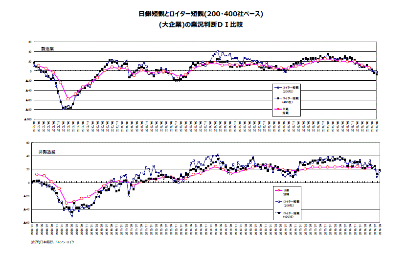 ●また、ロイター短観9月調査400社ベースの非製造業DIは6月調査から3ポイント低下し+19となった。また、200社ベースの非製造業の業況判断DIは6月調査の+24から7ポイント悪化の+17となった。