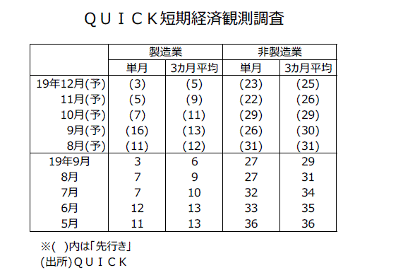 ●QUICK短観9月調査の製造業の12月までの「先行き見通し」は+3で9月実績の+3と同じである、非製造業の12月までの「先行き見通し」は+23で9月実績の+27から4ポイントの悪化予想である。非製造業の悪化は、10月に消費税率が引き上げられることを反映していよう。
