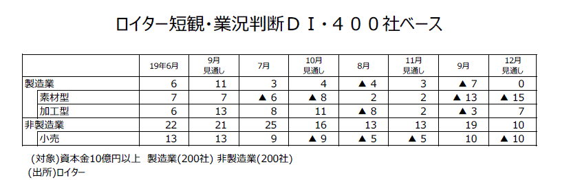 ●9月12日に発表されたロイター短観9月調査の調査期間は8月29日から9月9日である。9月調査400社ベースの製造業DIは6月調査から13ポイント低下し▲7となった。13年3月の▲11以来6年半ぶりの低水準になった。一方、200社ベースの製造業の業況判断DIは6月調査の+4から6ポイント悪化の▲2となった。こちらは13年4月の▲5以来6年5カ月ぶりの低水準だ。
