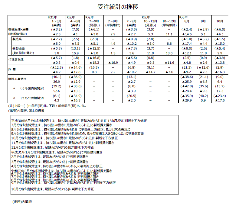 ●今回10月分では前月比が4カ月連続減少かつ4カ月移動平均が2カ月連続減少したことなどから下方修正され、18年12月分~19年3月分以来の「機械受注は、足踏みがみられる」という判断になった。