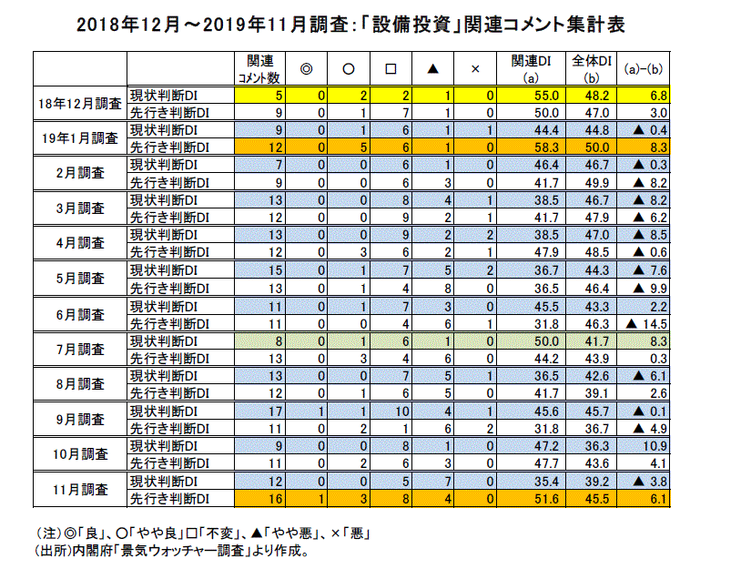 ●景気ウォッチャー調査の設備投資関連・DIのこの1年間の動きをみてみよう。18年12月分の景気ウォッチャー調査では、設備投資関連・現状判断DIは55.0(同5人)、設備投資関連・先行き判断DIが50.0(同9人)。19年1月調査では設備投資関連・現状判断DIは44.4(同9人)と悪化したが、設備投資関連・先行き判断DIが58.3(同12人)。このころはまだ、底堅い動きだった。