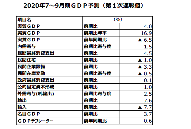 ●なお、現行統計(平成23年基準)で遡れる80年4~6月期以降で実質GDPが前期比年率2ケタの増加になったのは、87年10~12月期+11.2%、89年10~12月期+12.0%、90年4~6月期+11.0%、11年7~9月期+10.3%だけで、20年7~9月期が予測通りならば、過去最高を更新することになろう。