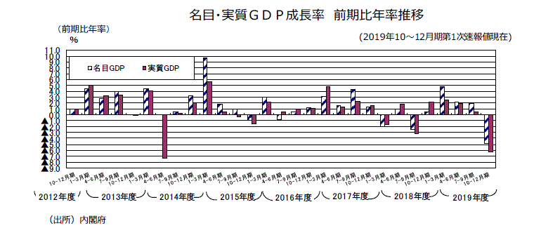 ●19年10~12月期実質GDP成長率・第1次速報値は前期比▲1.6%、前期比年率▲6.3%で、5四半期ぶりのマイナス成長となった。前期比年率▲6.3%は、前回の消費税率引上げがあった14年4~6月期の▲7.4%以来の減少率である。消費税率引上げの影響(駆け込み需要の反動減、実質購買力の低下)のほか、大型台風や暖冬もマイナスに作用した。19年10~12月期の雇用者報酬は名目で前期比+0.4%だったが、実質で同▲0.3%になった。内需の前期比寄与度は▲2.1%、外需の前期比寄与度は+0.5%だった。