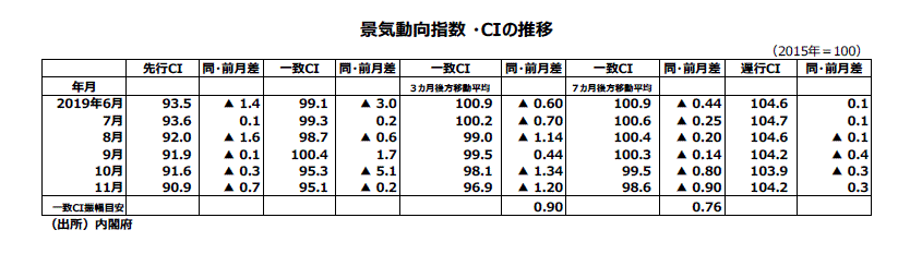 2019年11月分景気動向指数(速報値)