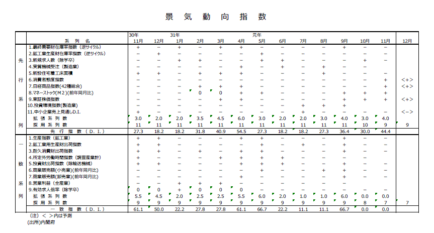 ●11月分の先行DIは44.4%と7カ月連続して景気判断の分岐点の50%を下回った。速報値からデータが利用可能な9系列中、消費者態度指数、日経商品指数、マネーストック、東証株価指数の4系列がプラス符号に、最終需要財在庫率指数、鉱工業生産財在庫率指数、新規求人数、新設住宅着工床面積、中小企業売上げ見通しDIの5系列がマイナス符号になった。