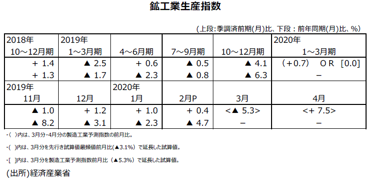 ●経済産業省は基調判断を19年8月分・9月分の「総じてみれば、生産はこのところ弱含み」から、10月分で15年8月分以来の「総じてみれば、生産は弱含み」に下方修正し、11月分・12月分でも判断を据え置いていたが、20年1月分では「総じてみれば、生産は一進一退ながら弱含んでいる」と上方修正した。2月分も判断は据え置きになった。