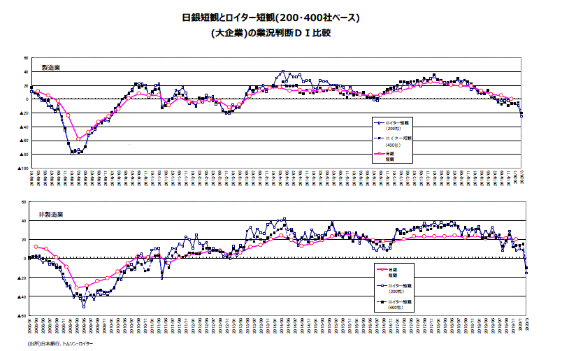 ●また、ロイター短観3月調査400社ベースの非製造業DIは12月調査の+14から24ポイント悪化し▲10となった。また、200社ベースの非製造業の業況判断DIは12月調査の+8から23ポイント悪化し▲15となった。
