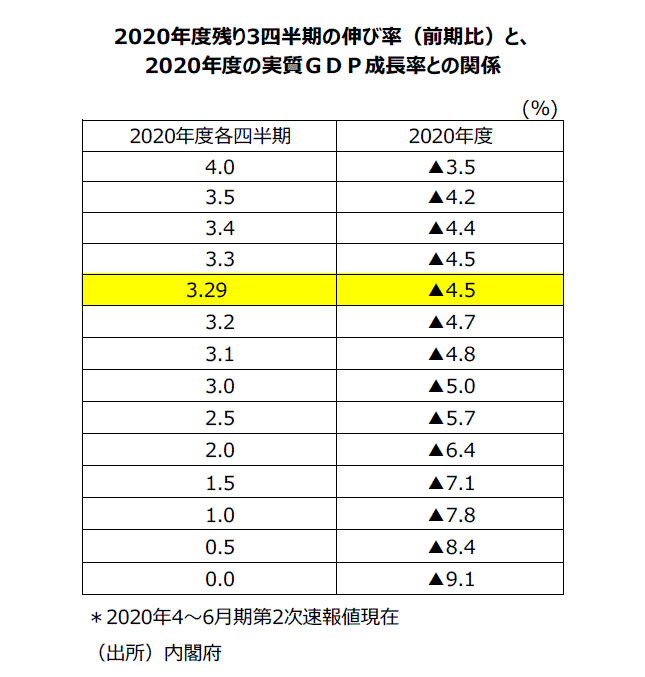 ●20年度実質GDP成長率・内閣府年央試算・前年度比▲4.5%を達成するには、20年度残り3四半期の前期比年率+13.9%(前期比+3.29%)が必要である。見通し達成は厳しい状況にあると言えよう。19年度から20年度へのゲタは▲1.3%である。20年度各四半期前期比+2.0%だと20年度実質GDP成長率・前年度比は▲6.4%のマイナス成長になる。