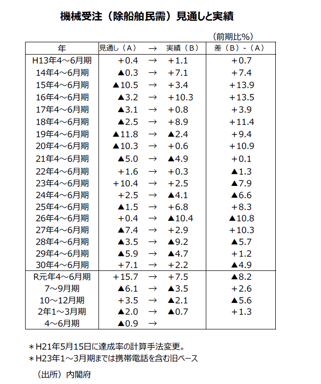 ●内閣府の基調判断の推移をみると、19年9月分では「機械受注は、持ち直しの動きに足踏みがみられる」という判断に下方修正された。その後10月分ではさらに下方修正され、18年12月分~19年3月分以来の「機械受注は、足踏みがみられる」という判断になった。11月分・12月分・20年1月分、2月分、3月分と、「機械受注は、足踏みがみられる」という判断であったが、新型コロナウイルス感染拡大の影響が大きく出た4月分では「機械受注は、足元は弱含んでいる」という判断に下方修正され、5月分では判断据え置きになった。