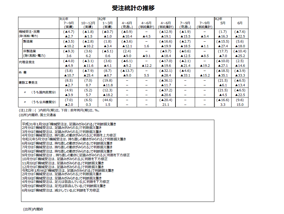 ●内閣府の基調判断の推移をみると、19年9月分では「機械受注は、持ち直しの動きに足踏みがみられる」という判断に下方修正された。その後10月分ではさらに下方修正され、18年12月分~19年3月分以来の「機械受注は、足踏みがみられる」という判断になった。11月分・12月分・20年1月分、2月分、3月分と、「機械受注は、足踏みがみられる」という判断であったが、新型コロナウイルス感染拡大の影響が大きく出た4月分では「機械受注は、足元は弱含んでいる」という判断に下方修正され、5月分では判断据え置きになった。今回6月分では「機械受注は、減少している」という判断に下方修正された。