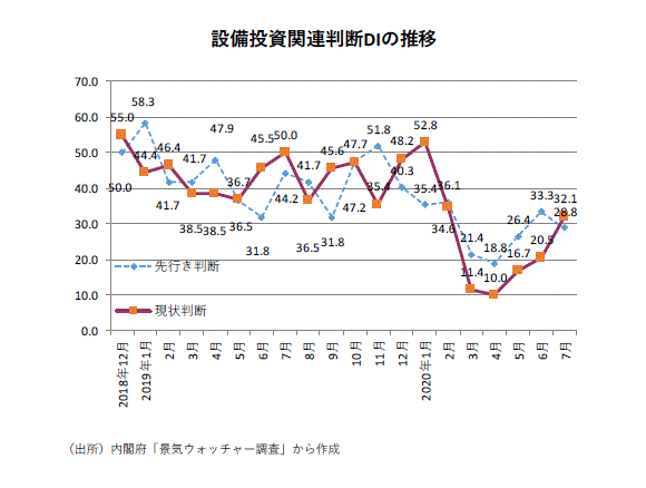 ●景気ウォッチャー調査の設備投資関連・DIの今年の動きをみよう。20年1月の現状判断DIが52.8(同9人)と18年12月分の55.0以来の50超となった。当時の設備投資関連・現状判断DIからは底堅さが感じ取れるようになってきていた。しかし、新型コロナウイルスの影響で現状判断DIは2月34.6(同13人)、3月11.4(同11人)、4月10.0(同5人)へと急落した。その後、緊急事態宣言解除もあり、5月は16.7(同9人)、6月は20.5(同11人)、7月は32.1(同14人)と徐々に持ち直してきた。7月のコメントは概ね「新型コロナウイルスの影響により客先業界で設備投資がなく、売上は厳しい状況である。」(東海、電気機械器具製造業(経営者))のような厳しいものが多い。