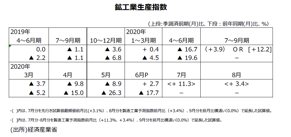 ●鉱工業生産指数・4~6月期速報値・前期比は▲16.7%の低下と2四半期ぶりの低下になった。低下幅は2015年基準では最大になった。