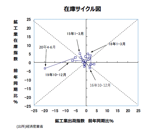 ●大きな動きをチェックするために、鉱工業全体で縦軸に在庫の前年比を、横軸に出荷の前年比をとった在庫サイクル図をつくると、17年10~12月期以降、45度線を上回って推移し、概ね「在庫積み上がり局面」が続いていた。19年10~12月期、出荷の前年同期比が▲6.5%、在庫が同+1.2%、20年1~3月期、出荷の前年同期比が▲5.2%、在庫が同+2.9%と、どちらも「在庫調整局面」であった。20年4~6月期は、出荷の前年同月比が▲19.8%、在庫が同▲3.4%と、出荷は大幅に減少したものの在庫調整がさらに進んだ。引き続き、「在庫調整局面」の状態にある。