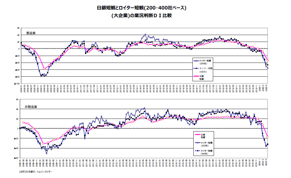 ●今回の日銀短観は、新型コロナウイルス感染拡大の影響で、製造業、非製造業とも、業況判断が大幅に悪化し、リーマンショックの時以来の水準になったが、当時の最悪水準(09年3月調査)は下回らなかった。5月中旬から下旬にかけ緊急事態宣言が解除され、経済活動が動き出したことから大企業では業況判断DIの先行き改善が見込まれてはいるものの、不透明感が強く改善のテンポは極めて緩やかである。また、今回の短観では製造業の雇用判断DIが「不足超」から「過剰超」に転じたことが気がかりだ。次回9月調査が注目される状況だ。