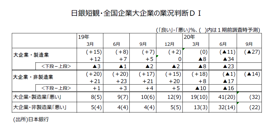 ●大企業・製造業で「悪い」と答えた割合は17年12月調査で4%まで低下したが、そこを底に19年3月調査では8%に、6月調査では9%、9月調査では10%に、12月調査では12%、20年3月調査では19%と増加してきたが、今回6月調査で41%まで大きく増加した。