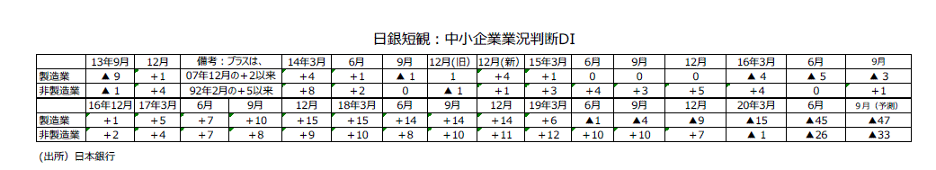 ●中小企業・製造業の「先行き」の業況判断は▲47と「最近」▲45から2ポイント悪化する見通しである。また、中小企業・非製造業は▲33とこちらは「最近」▲26より7ポイントの悪化見通しである。