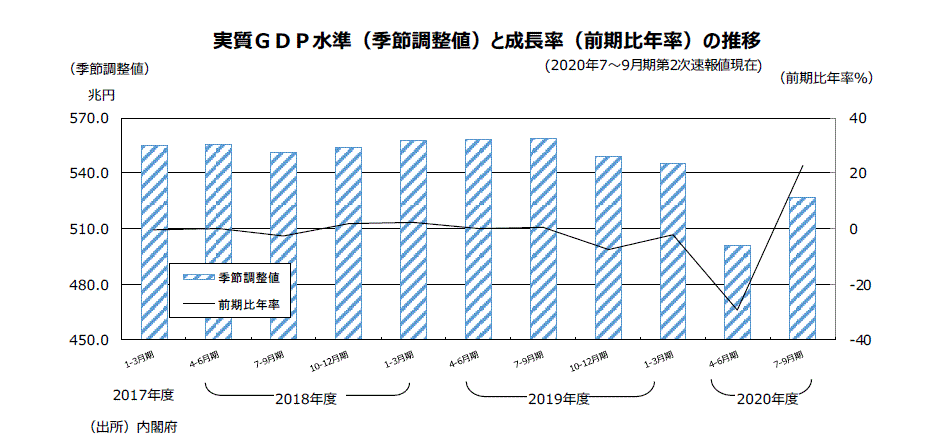 ●20年7~9月期名目GDP成長率・第2次速報値は前期比+5.5%、前期比年率+23.9%となり、第1次速報値の前期比+5.2%、前期比年率+22.7%から上方修正となった。名目GDPの季節調整値は539.0兆円である。