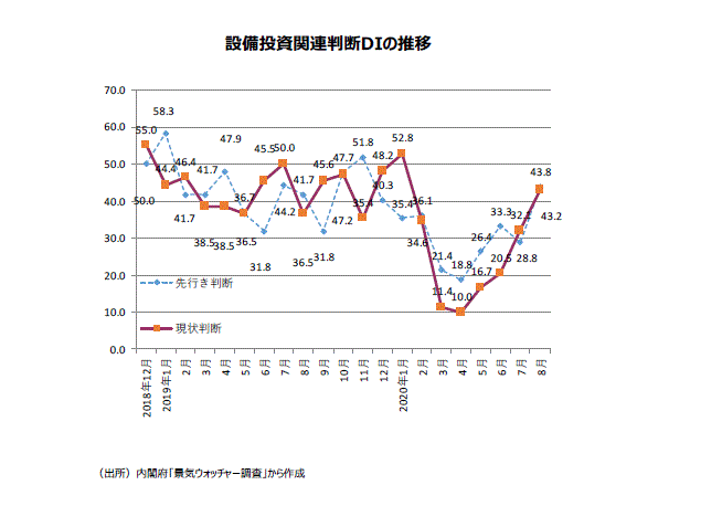 ●景気ウォッチャー調査の設備投資関連・DIの今年の動きをみよう。20年1月の現状判断DIが52.8(同9人)と18年12月分の55.0以来の50超となった。当時の設備投資関連・現状判断DIからは底堅さが感じ取れるようになってきていた。しかし、新型コロナウイルスの影響で現状判断DIは2月34.6(同13人)、3月11.4(同11人)、4月10.0(同5人)へと急落した。その後、緊急事態宣言解除もあり、5月は16.7(同9人)、6月は20.5(同11人)、7月は32.1(同14人)、8月は43.8(同12人)と持ち直してきている。8月のコメントには「客の設備投資意欲に関しては、業種によりばらつきはあるものの、全体的に良いとはいえない。」(東北、通信会社(営業担当))といったものがあった。