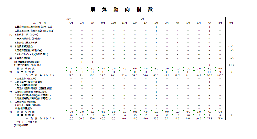 ●また、9月分の先行DIでは、数値が判明している消費者態度指数、日経商品指数、東証株価指数、中小企業売上げ見通しDIの4系列で、全系列がプラス符号になることが判明している。9月分速報値段階の先行DIは44.4%以上100.0%以下になることが確定している。
