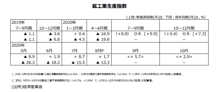 ●鉱工業生産指数・8月分速報値・前月比は+1.7%と3カ月連続の上昇になった。新型コロナウイルス感染症の影響で停滞した生産活動の回復基調が6月以降続いたことがわかる。季節調整値の水準は88.7とまだ低水準ながら、20年3月の95.8以来の水準になった。前年同月比は▲13.3%で11カ月連続の低下となったが6月分の▲18.2%、7月分の▲15.5%からマイナス幅は縮小した。